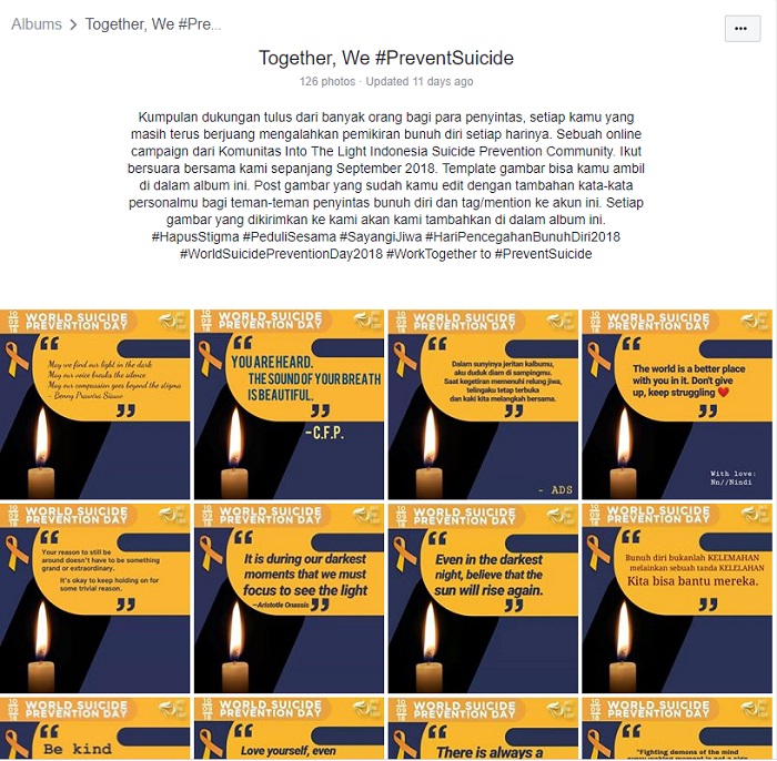 Sebagai contoh, pada Hari Pencegahan Bunuh Diri di tahun 2018, Into the Light menyediakan spanduk ‘Hari Pencegahan Bunuh Diri Sedunia’ yang dapat di edit, di mana pengikut mereka bisa menambahkan pesan positif dan membagikannya secara online menggunakan hashtag #CegahBunuhDiri. Unggahan tersebut disukai oleh 359 orang di Instagram, dan 126 pengikut merespon di Twitter dengan spanduk yang telah dibuat khusus. Spanduk tersebut mempresentasikan pesan personal mereka untuk mendukung rekan-rekan mereka yang memiliki pemikiran bunuh diri. Sebagaimana yang dibagikan oleh seorang pengikut, ‘Kamu tidak harus berjuang sendirian, kami ada di sini untukmu.’ Contoh lain adalah sebuah infografis berjudul ‘Menghadapi Rekan Suicidal,’ yang dibagikan oleh 1726 orang di Facebook dan memantik diskusi online lebih lanjut. Seorang pengguna dapat berkomentar, ‘Saya ingin mengetahui cara menangani pemikiran bunuh diri kita sendiri,’ dan admin Into the Light atau pengikut lainnya dapat merespon. Beberapa pengikut mengunggah komentar-komentar berisi dukungan, seperti ‘Kita tidak dapat menghindari masalah, namun bunuh diri juga bukanlah sebuah solusi’. Unggahan media sosial memungkinkan pengikut muda mendapatkan pemahaman mengenai isu bunuh diri, membangun rasa percaya dan mendapatkan dukungan sosial, yang lalu dapat mendorong diskusi lebih lanjut tentang topik bunuh diri yang sebelumnya tidak dibicarakan. Ruang seperti ini tidak ditawarkan pada inisiatif pemerintah yang ada.